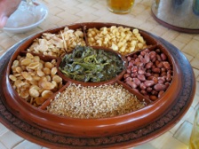 A salad of pickled tea leaves served with various crunchy bits and sauces (fried peas, peanuts and garlic; toasted sesame, fresh garlic, tomato, green chili, crushed dried shrimps, preserved ginger) and dressed with peanut oil, fish sauce and lime. Unique and delicious